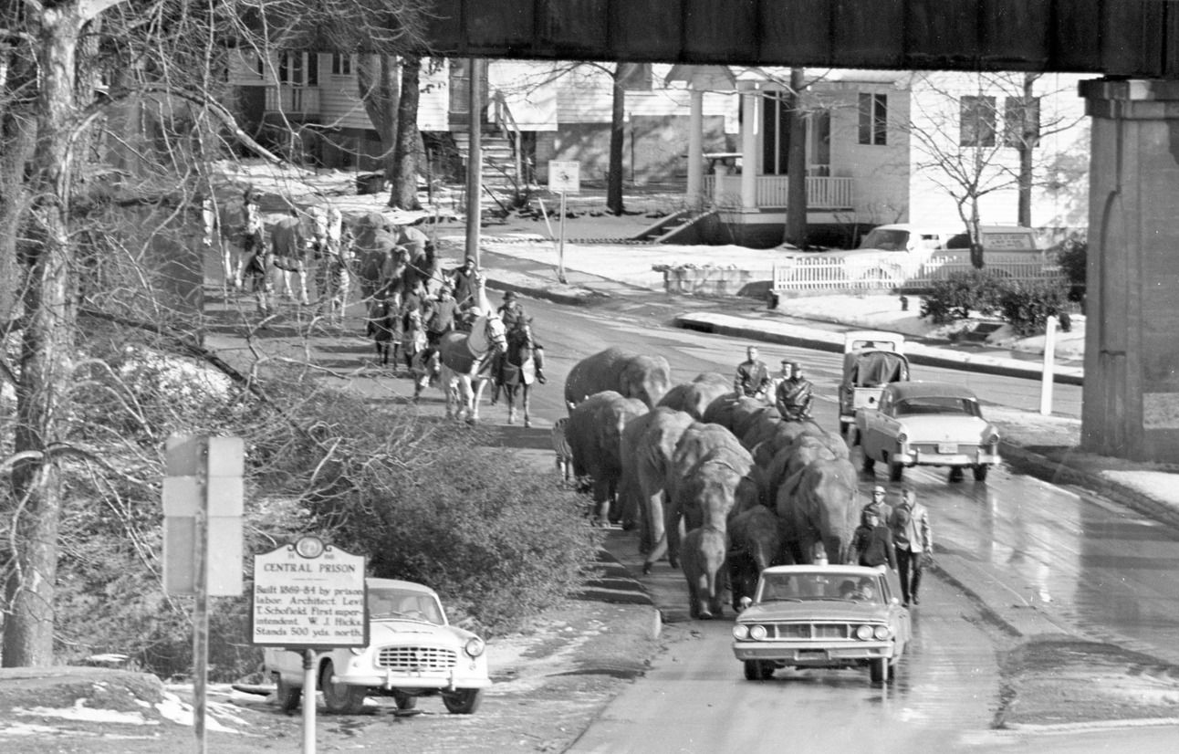 Barnum and Bailey Circus animals walking down West Cabarrus Street on their way to the fairgrounds. February 1965.