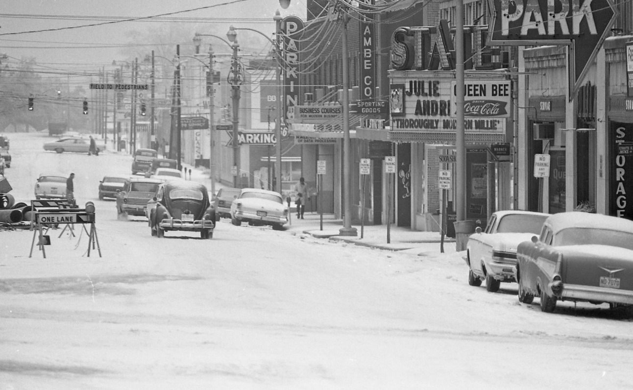 A snow-covered South Salisbury Street in downtown Raleigh taken in 1968.