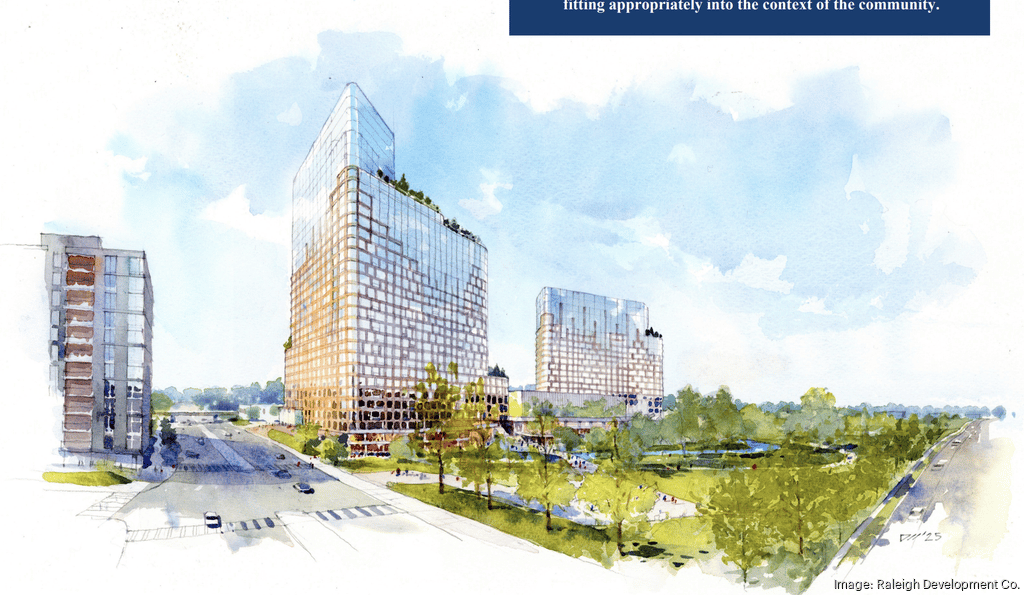 In a reversal from two years ago, Raleigh City Council voted 6-2 to approve a rezoning that will allow two towers of up to 30 stories on Peace Street near the Smoky Hollow development. The project, by Raleigh Development Co., could include nearly 1,000 apartments, 500,000 square feet of office space, and ground-floor retail connected by a pedestrian promenade and grand stair into the future Smoky Hollow Park.