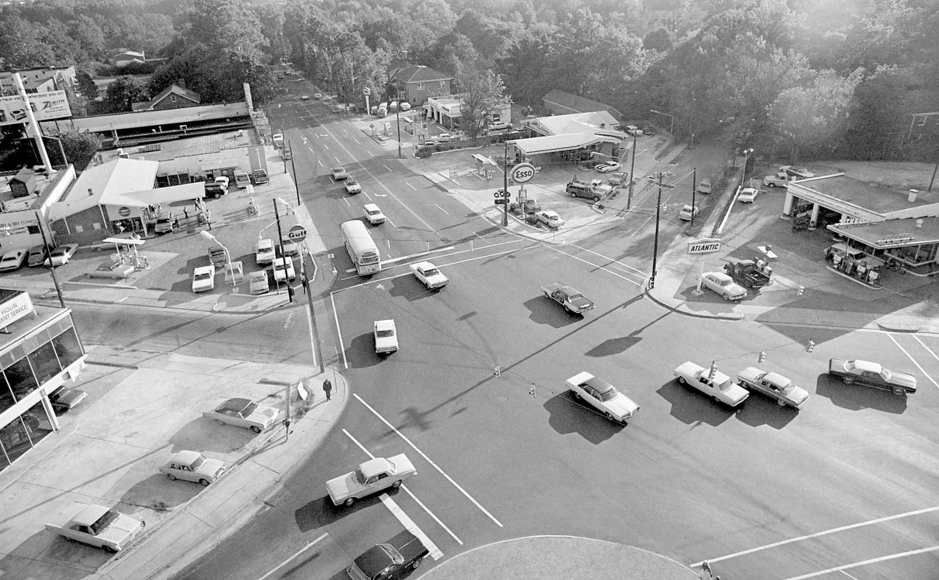 Five Points from the roof of Hayes Barton Baptist Church, 1970.